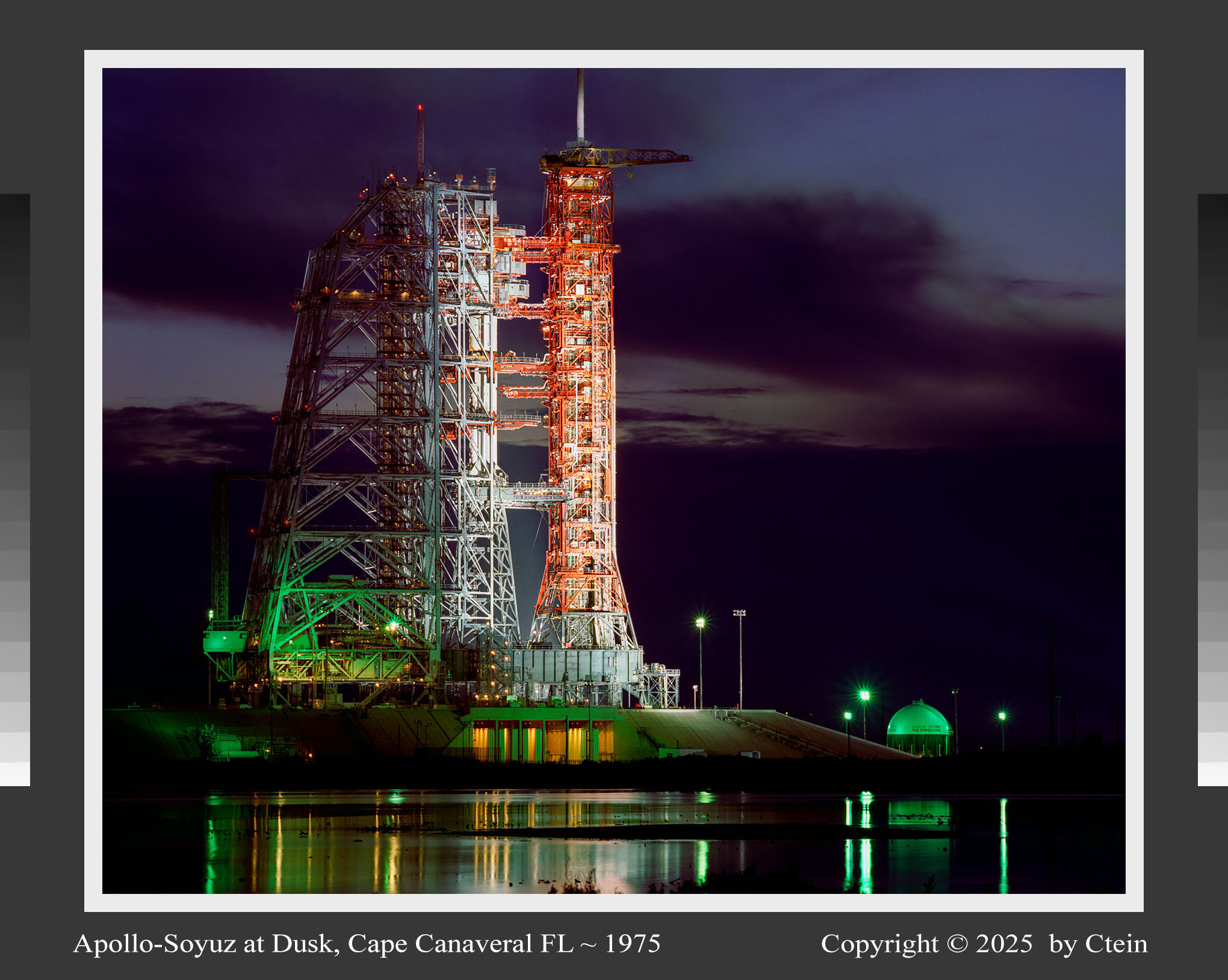 Apollo-Soyuz at Dusk, Cape Canaveral FL ~ 1975 I just reprinted this after twenty years, with much-improved color and tonality, grain, and detail! This image shows the floodlit launch complex in stark relief in shades of red, white, grey, yellow and electric green. The backdrop for this is a soft, dark grey-purple sky with clouds. (440K JPEG) Ultrachrome print sizes: 14" x 11", 22" x 17", 32" x 24", 44" x 36"