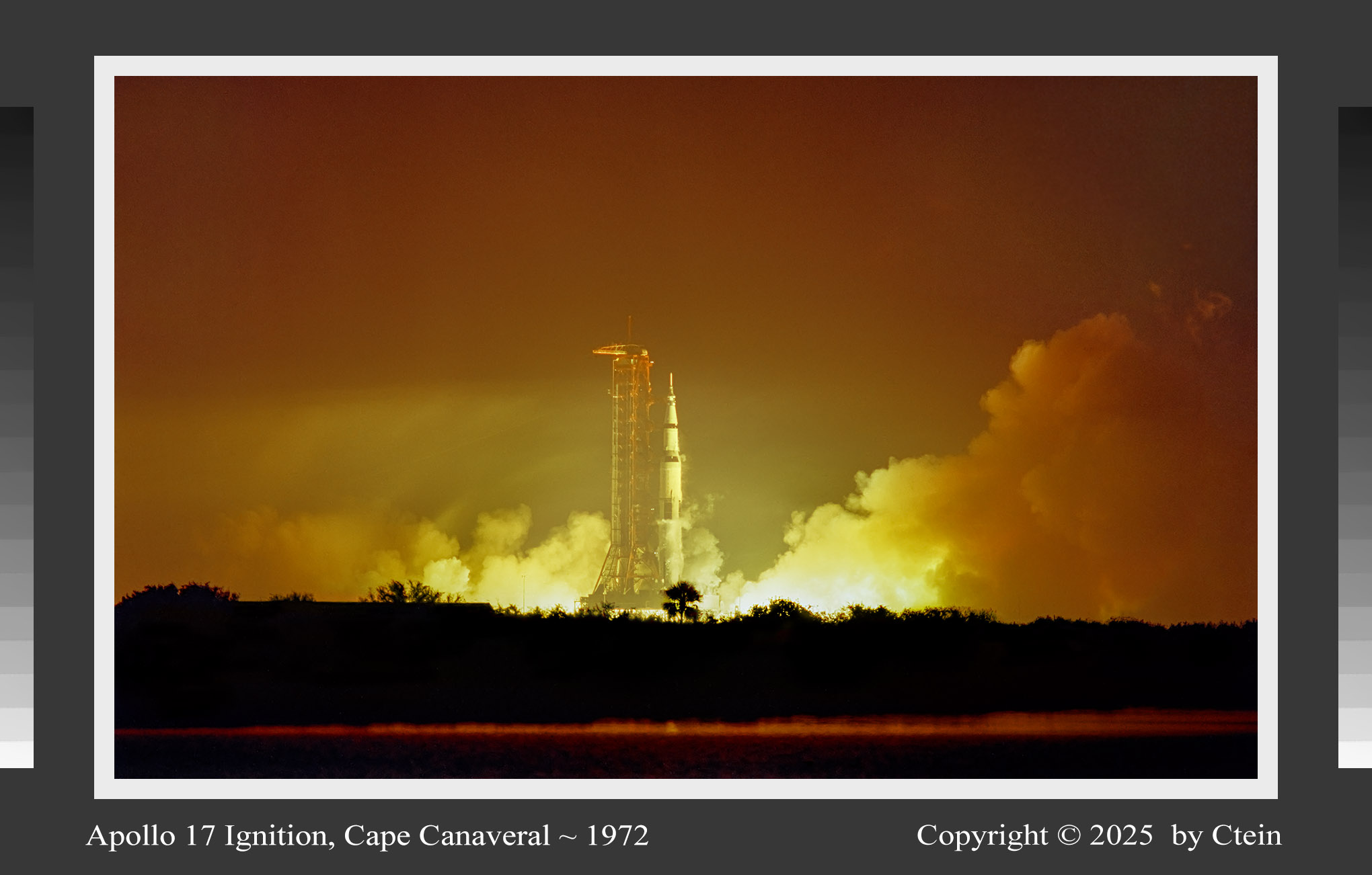 Apollo 17 Ignition, Cape Canaveral ~ 1972 I just reprinted this after twenty years, with much-improved color and tonality, grain, and detail! The Saturn V engines turn the sky deep orange and illuminate the rocket with a brilliant yellow light. Billowing clouds of smoke and steam run from incandescent white through yellow and orange to rich browns. (224K JPEG) Ultrachrome print sizes: 14" x 11", 22" x 17", 32" x 24" 44" x 36"