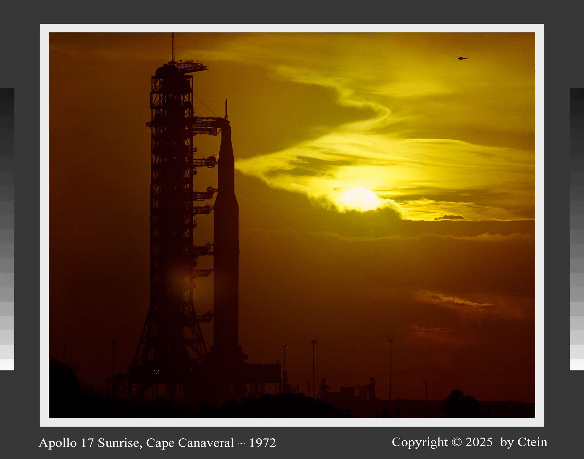 Apollo 17 Sunrise, Cape Canaveral ~ 1972 I just reprinted this after twenty years, with much-improved color and tonality, grain, and detail! Sunrise behind a nearly-silhouetted Apollo 17 shows a giant white sun rising behind banks of rich sienna and golden orange-yellow clouds, as a helicopter flies above. A visual poem in microtones of yellows. (276K JPEG) Ultrachrome print sizes: 14" x 11", 22" x 17", 32" x 24", 44" x 36"
