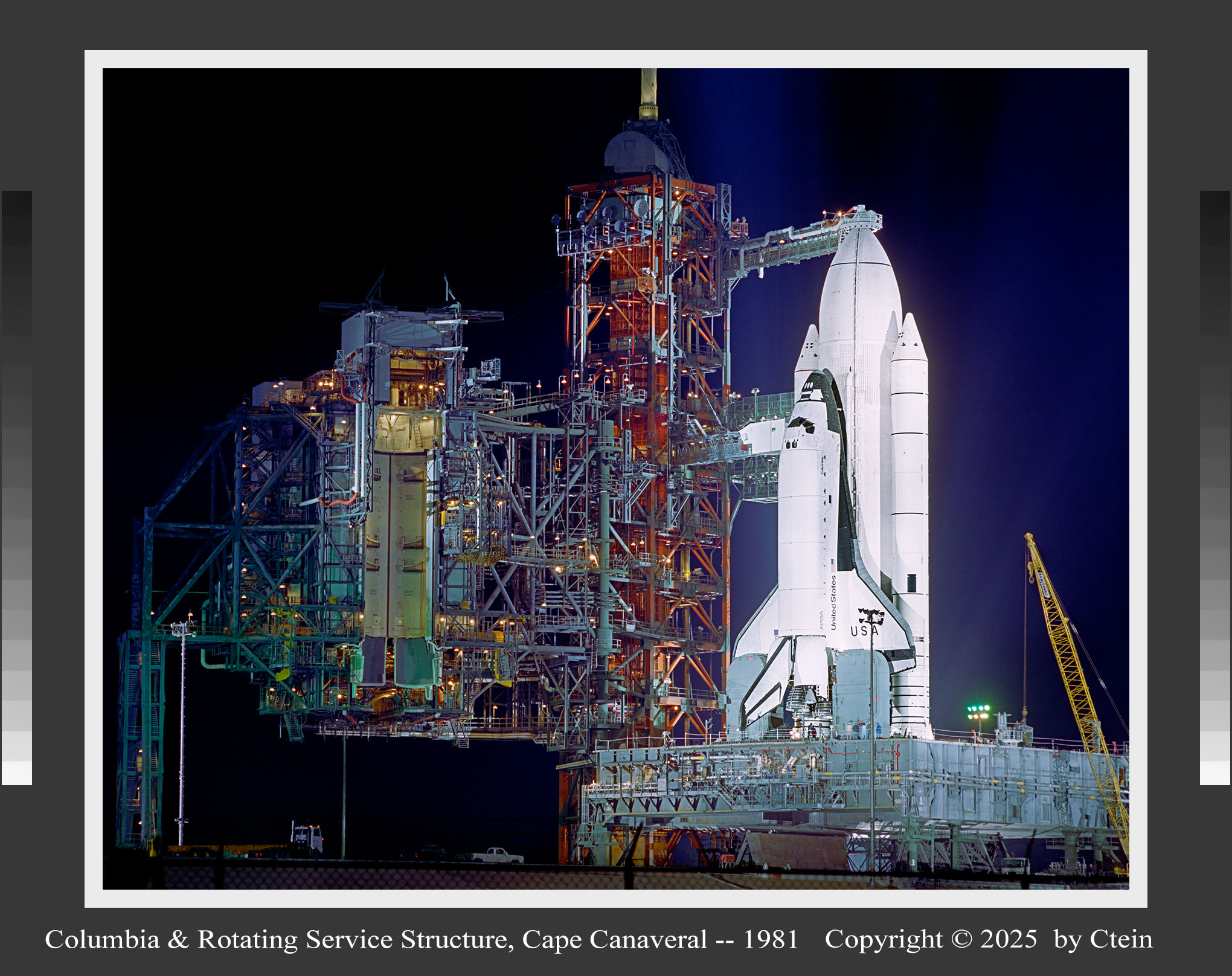 Columbia & Rotating Service Structure, Cape Canaveral ~ 1981 I just reprinted this after twenty years, with much-improved color and tonality, grain, and detail! Another night photograph of the first space shuttle, with Columbia gleaming brilliant white in a cool slate-gray and green launch complex. Pinpoint yellow lights and red and yellow structural elements against a deep black sky lend color to a largely neutral palette. (542K JPEG) Ultrachrome print sizes: 14" x 11", 22" x 17", 32" x 24", 44"x 36"