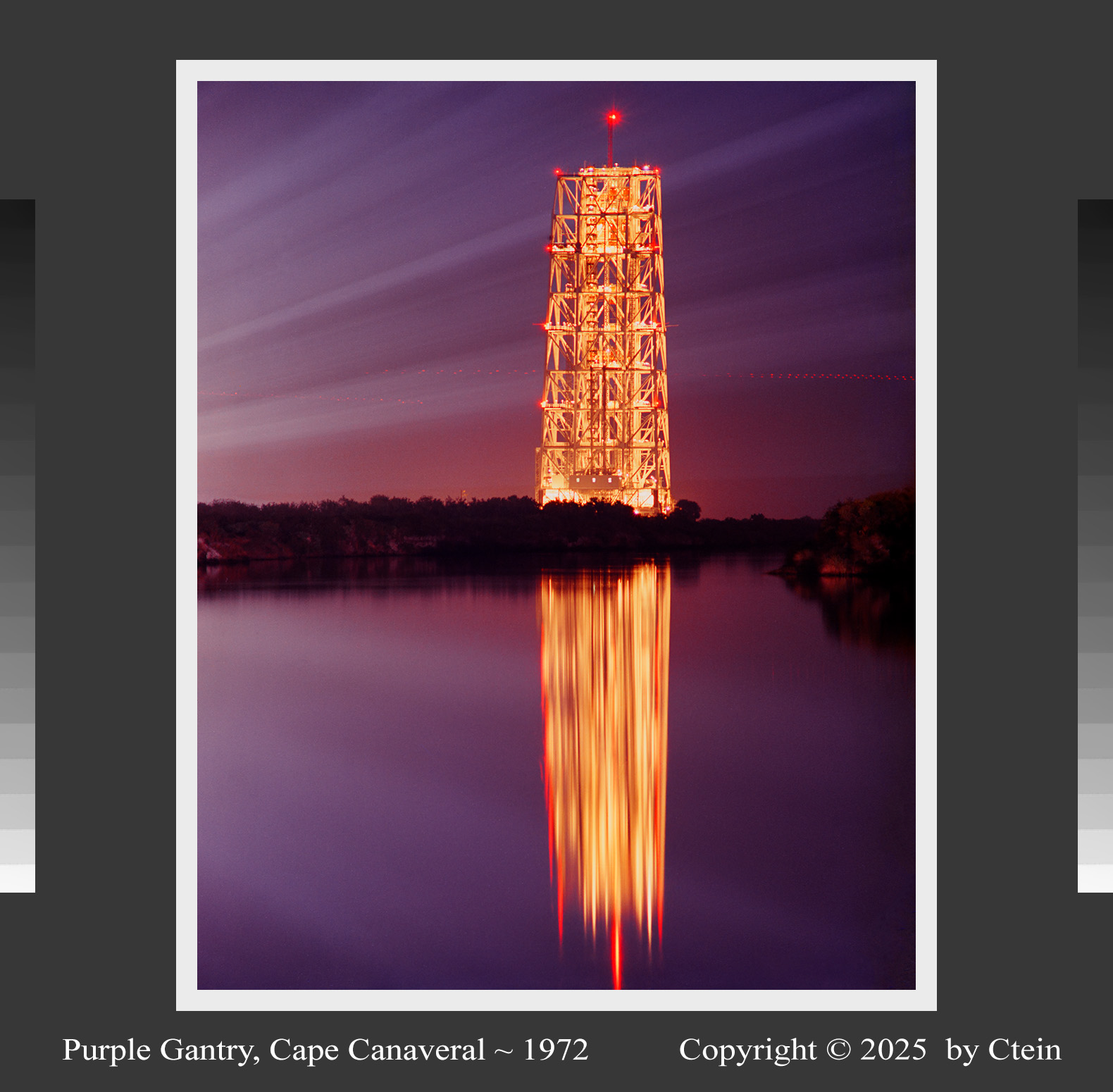 Purple Gantry, Cape Canaveral ~ 1972 I just reprinted this after twenty years, with much-improved color and tonality, grain, and detail! Floodlights illuminating Apollo 17 (off-camera left) fill the sky with radiating rays of pale light in purples, blues, and dusky reds. The illuminated gantry glows incandescent in yellows, oranges, and hot reds, all gracefully reflected in the waters spread below the gantry and sky to give this photograph a painterly quality. (366K JPEG) Ultrachrome print sizes: 11" x 14", 17" x 22", 24" x 32", 36" x 44"