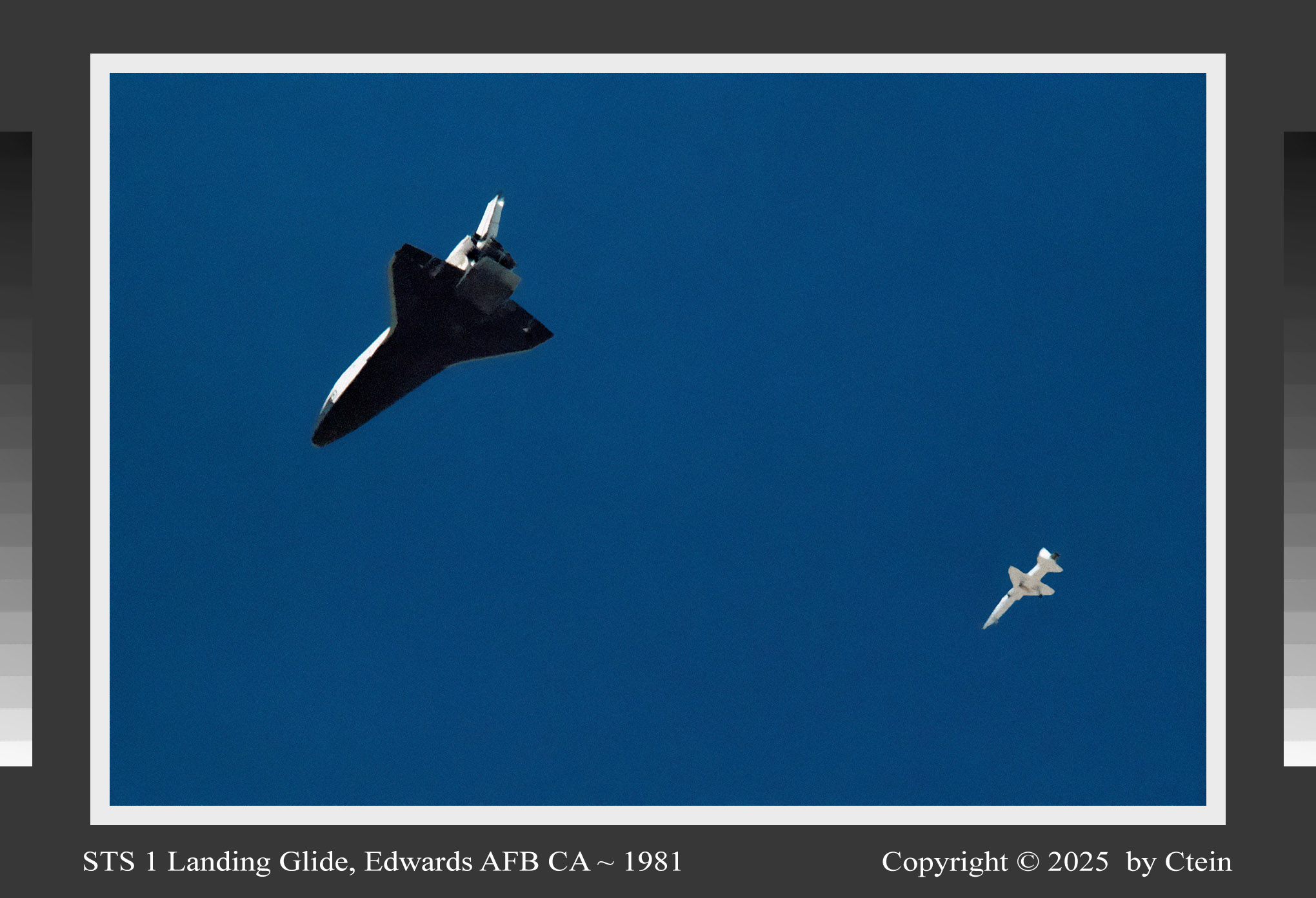 STS 1 Landing Glide, Edwards AFB CA ~ 1981 I just reprinted this after twenty years, with much-improved color and tonality, grain, and detail! The space shuttle Columbia and its chase plane, nearly pure white and pure black, pass overhead in a deep cobalt-blue sky, as the first space shuttle prepares for landing. (345K JPEG) Ultrachrome print sizes: 14" x 11", 22" x 17", 36" x 24"