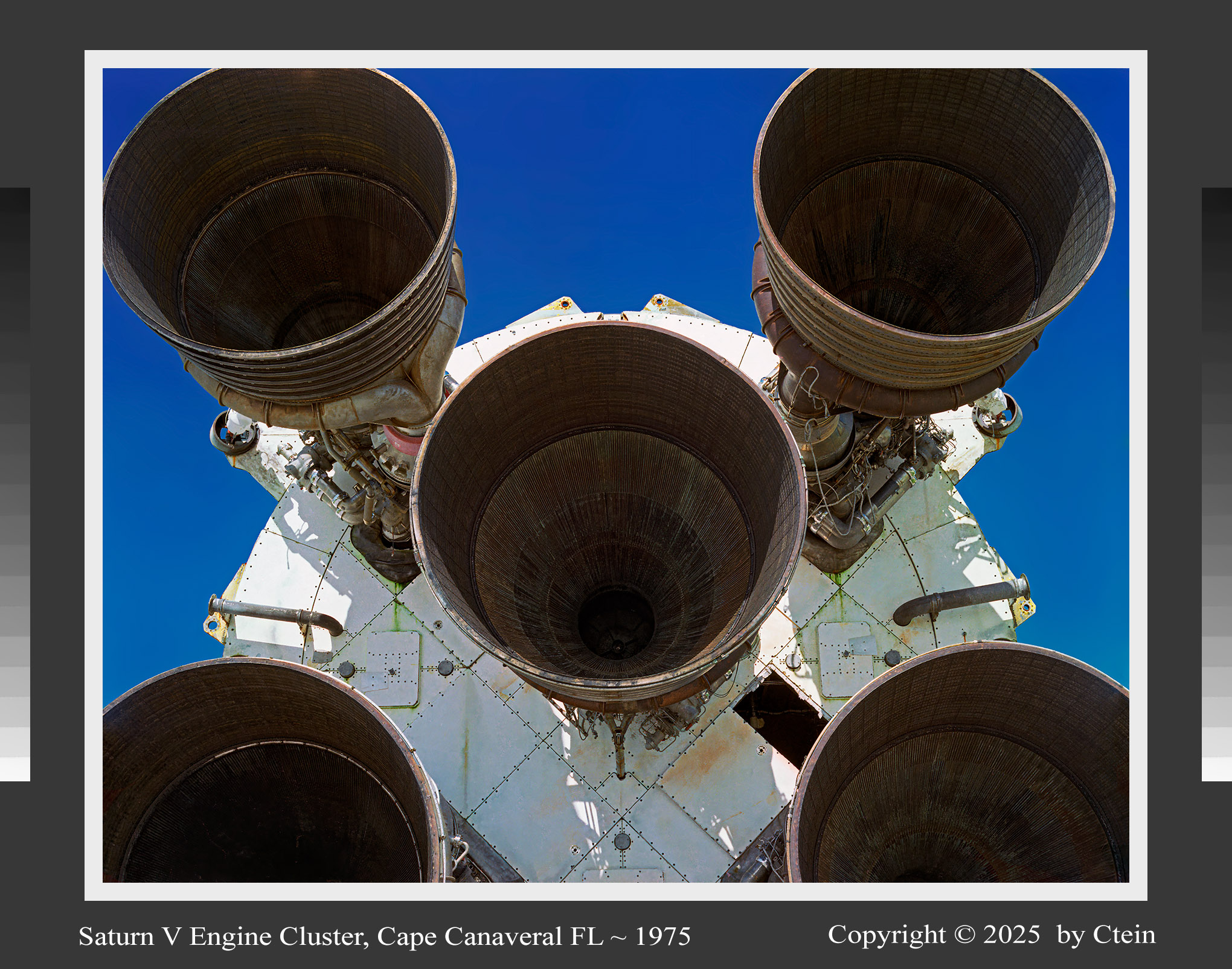 Saturn V Engine Cluster, Cape Canaveral FL ~ 1975 I just reprinted this after twenty years, with much-improved color and tonality, grain, and detail! Hard-edged geometries in whites, grays, browns, and blacks provide a stark contrast to a deep blue sky in this paean to industrial metal. (733K JPEG) Ultrachrome print sizes: 14" x 11", 22" x 17", 32" x 24", 44" x 36"