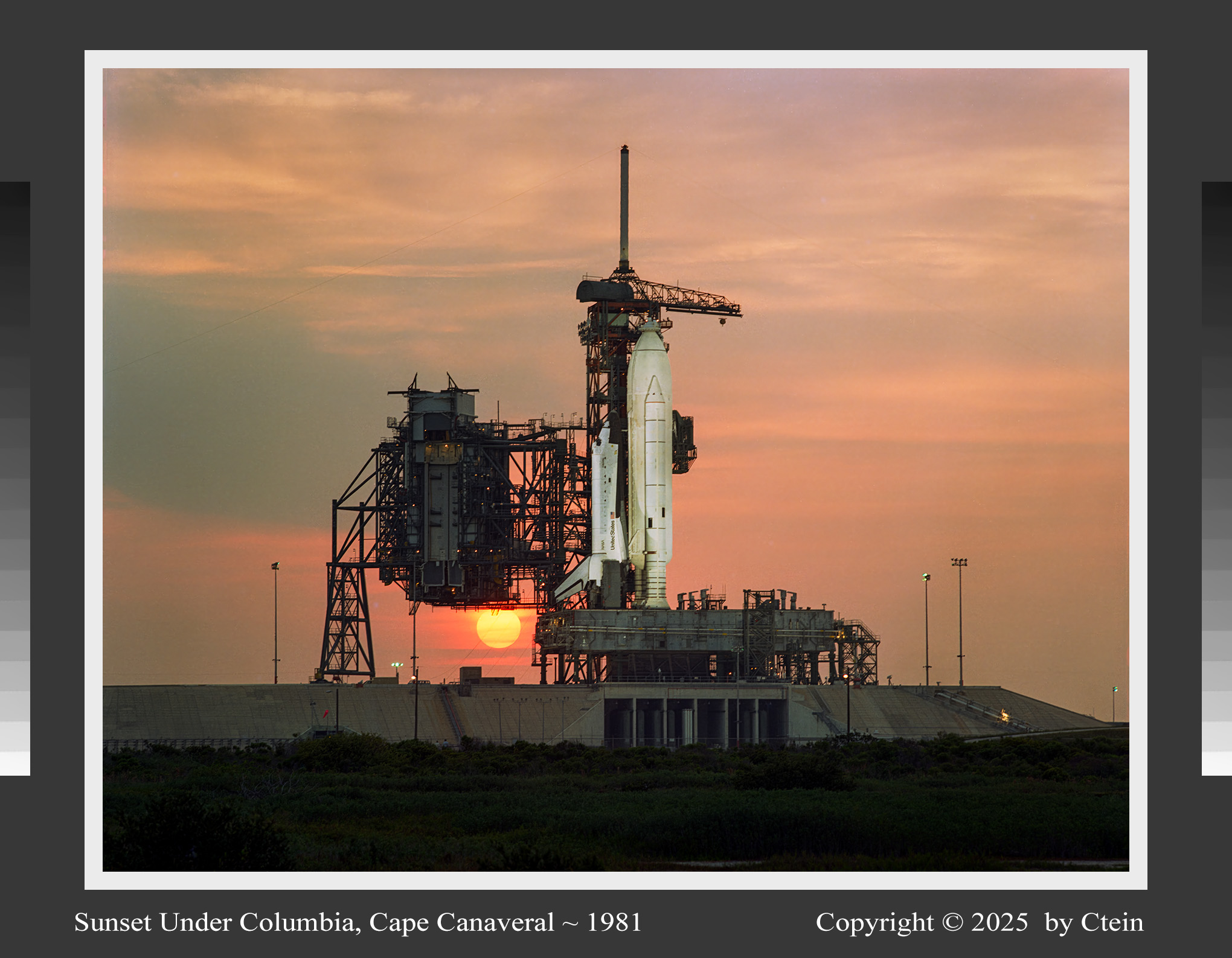 Sunset Under Columbia, Cape Canaveral ~ 1981 I just reprinted this after twenty years, with much-improved color and tonality, grain, and detail! A golden sun sets through red clouds behind the launch complex for the first shuttle mission. Salmon light permeates the sky and clouds, providing a peaceful backdrop to the soft grays and pale whites of the shuttle and its launch complex. (532K JPEG) Ultrachrome print sizes: 14" x 11", 22" x 17", 32" x 24", 44" x 36"