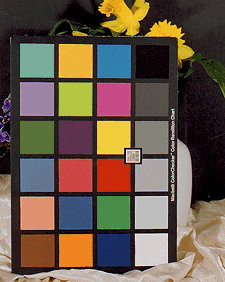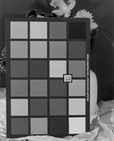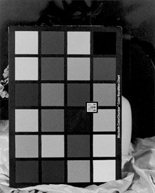 Worse, color negatives are flat by B&W standards, so you'll find yourself printing with a heavy magenta filter pack to get adequate contrast. That means you're throwing away most of the green light. As Figures 9-1 and 9-2 show, VC paper prints color negatives only slightly better than ordinary orthochromatic paper does, and nowhere near acceptably. Compare these figures with the Macbeth chart in Plate 2; all were printed from the same 35 mm Fuji Reala negative (a low-contrast, high-saturation film). Both the VC and graded paper prints render reds, yellows, and greens far too dark (notice what happens to the daffodil) and blues far too light. You can see the impact of these distortions on a pictorial scene in Plate 3 and Figures 9-6 and 9-8. These prints of Lake Shasta and Mt. Lassen were all made from a 120 format Konica Impresa 50 negative (a normal-contrast, normal-saturation film).
