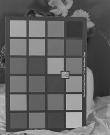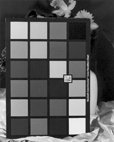 Figure 9-4 This print, on Panalure grade M paper, is a little soft, but it's close to the correct contrast. I made this print with a 35 CC yellow + 45 CC magenta filter pack, to correct the tones in the reds. All the colors are a good B&W match in density to the values in Plate 2.