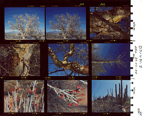 First, I proof all my negatives religiously. I'm 10 years behind in making enlargements, but my proof files are up to date. Good proof sheets provide accurate information about the relative color balance and density of negatives and show what areas of the image will need local exposure correction. I make my proofs with the enlarger height set for the same print magnification I would use to make an 8 x 10 print from the negatives I am proofing. I write the exposure data in my printing log and on the edge of the proof sheet for future reference (Plate 1).